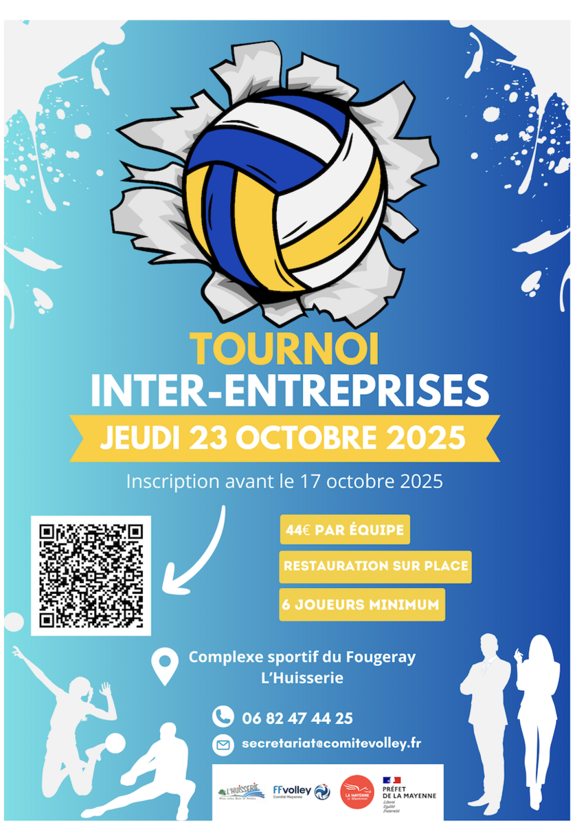 Le Comité Départemental de Volley-ball de la Mayenne organise, pour la saison 2025/2026, son 1er Tournoi Interentreprises qui se déroulera le Jeudi 23 Octobre 2025 à L’Huisserie.