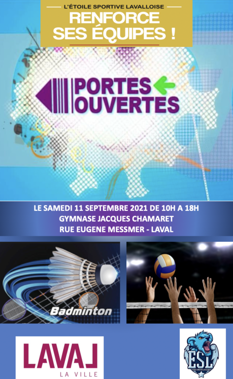 Nous vous donnons RDV de 10h à 18h le Samedi 11 Septembre au Gymnase Chamaret, 19 Rue Eugène Messmer à Laval, pour prendre des renseignements et pourquoi pas tester l'une ou l'autre des disciplines (Volley-Ball et Badminton).